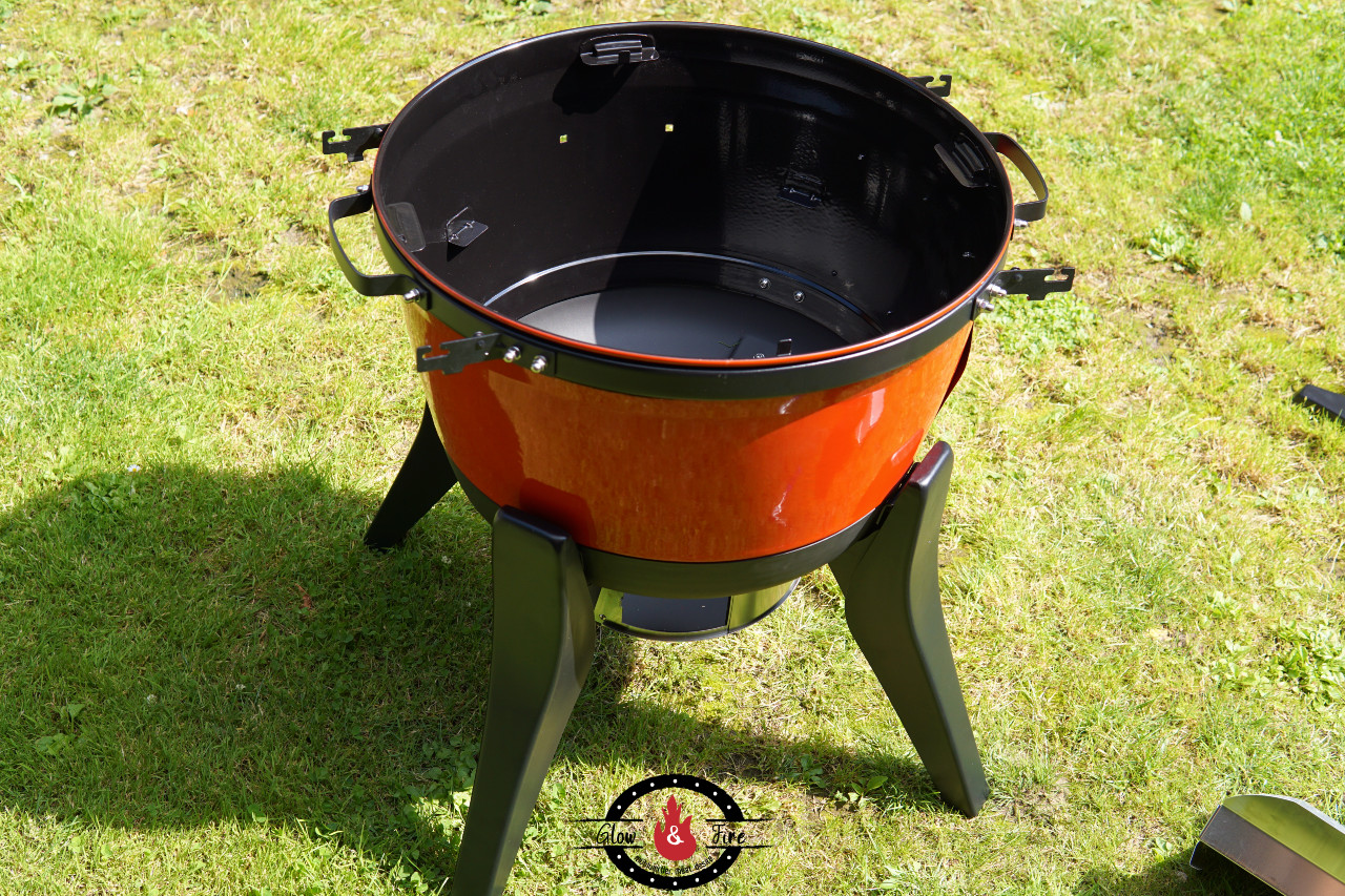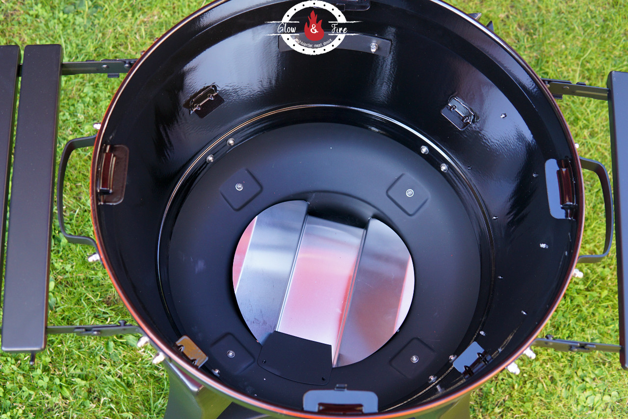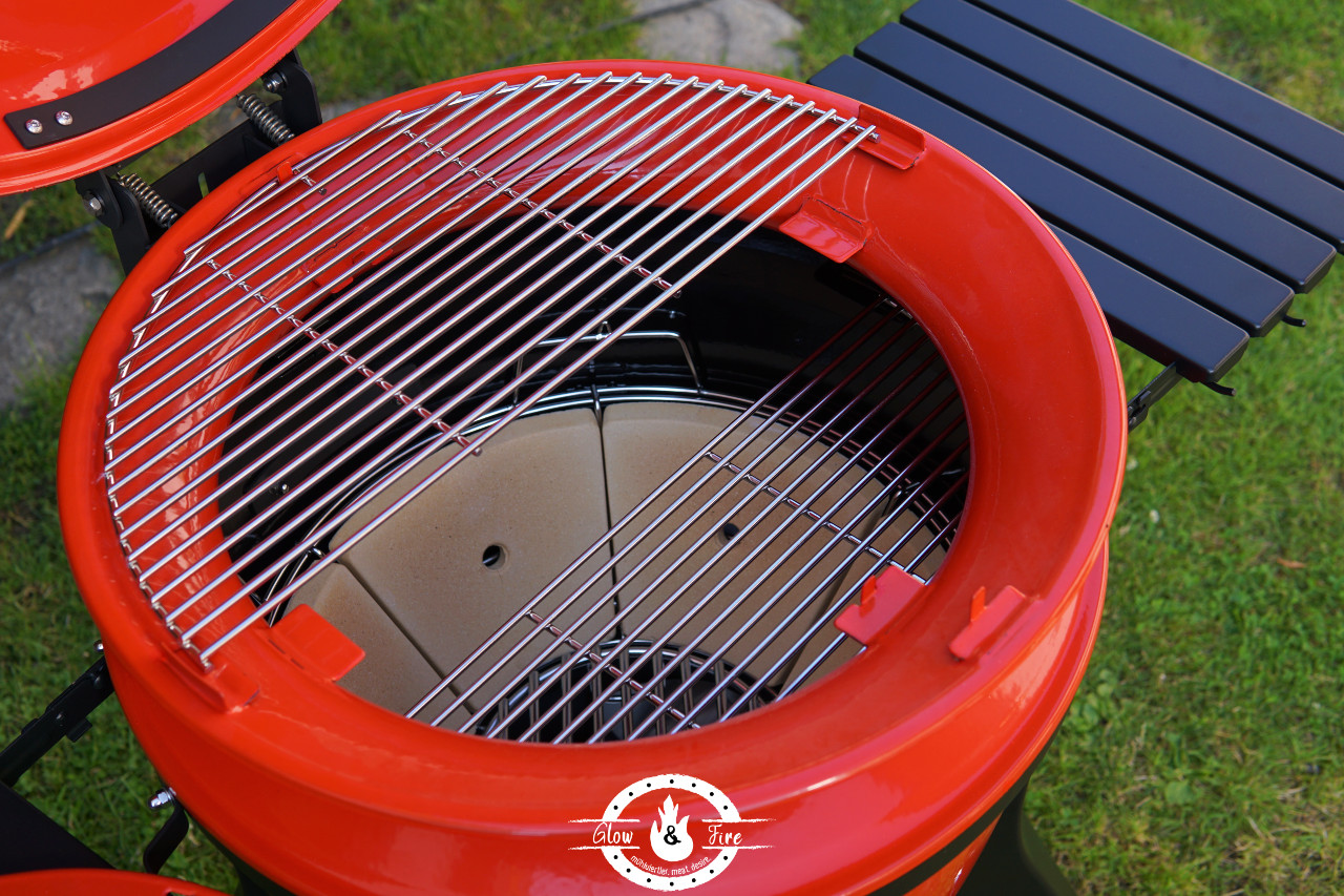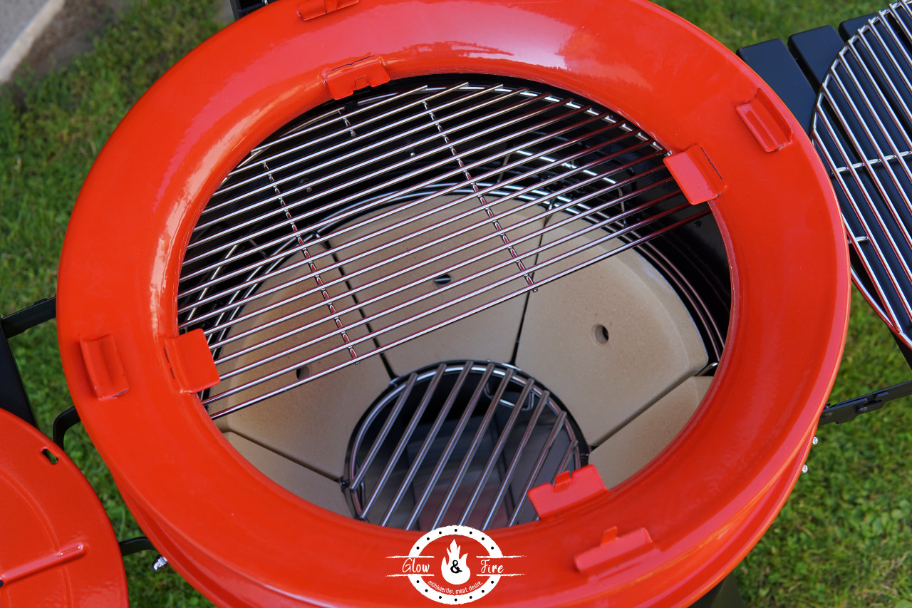 Über dem Kohlerost befindet sich der zweigeteilte Grillrost. Dieser kann in zwei verschieden Höhen eingehängt werden. Eine Deflektorplatte zwischen Glut und Rost ist hier nicht vorgesehen. Für Low & Slow bzw. Longjobs wurde dem Kamado Kettle Joe aber ein sogenannter „Slowroller“ verpasst.