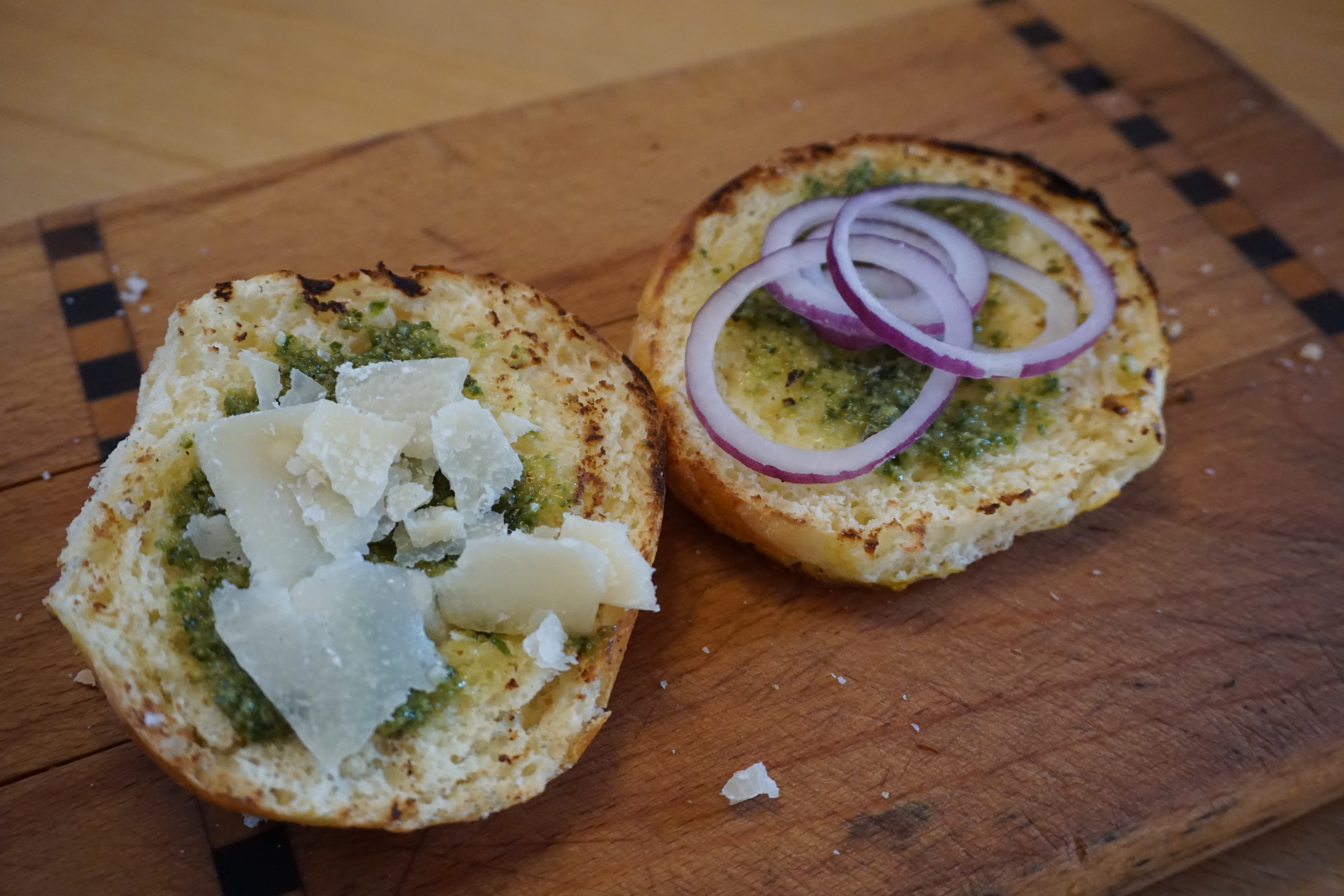 Währenddessen werden die Burgerweckerl mit Basilikumpesto bestrichen und mit Parmesan, Zwiebelringe und Rucola belegt.