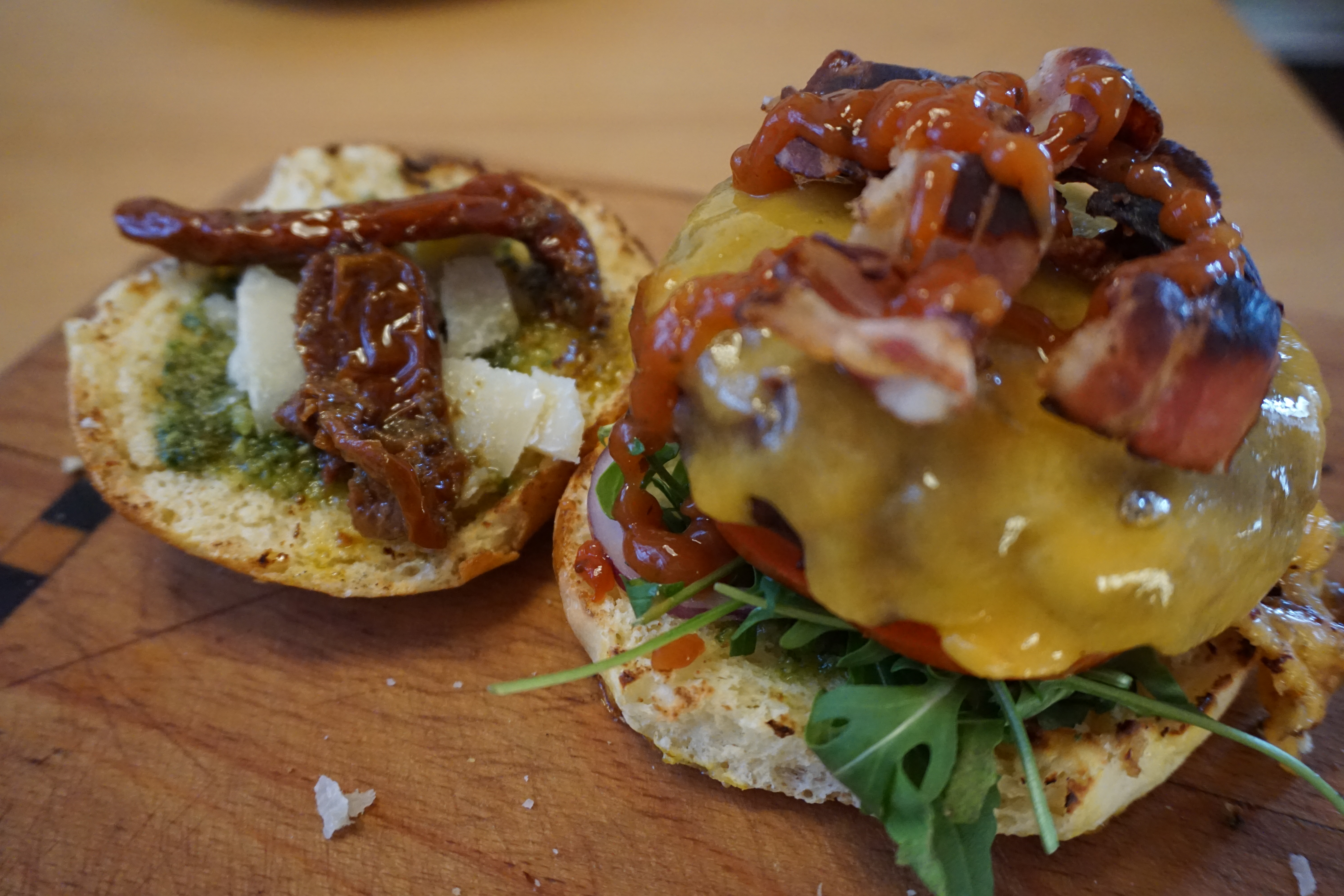 Sobald das Fleisch fertig ist, wird dieses ebenfalls am Weckerl platziert, auf das Fleisch kommt noch etwas Chilisauce und je Burger zwei getrocknete Tomaten.